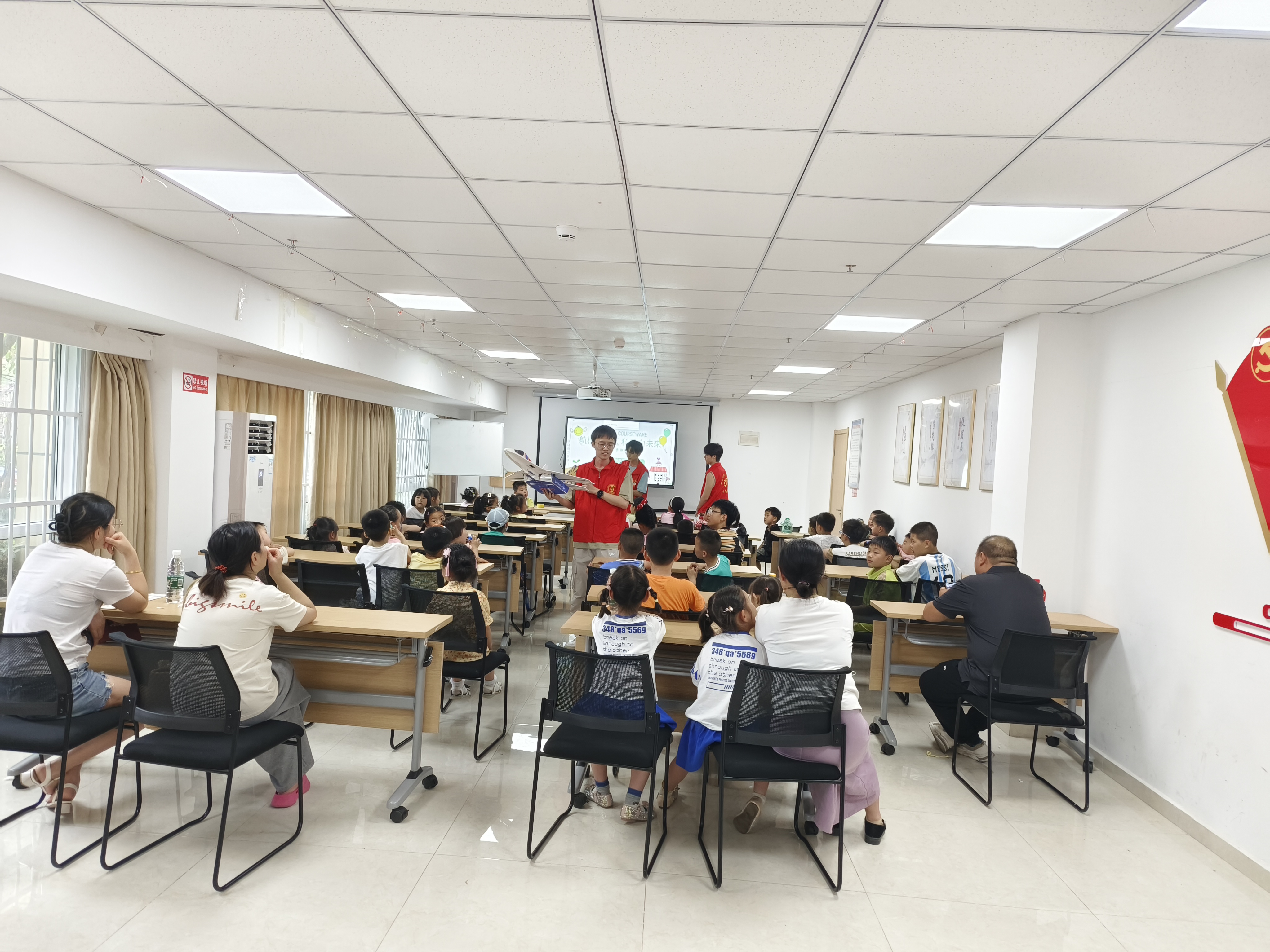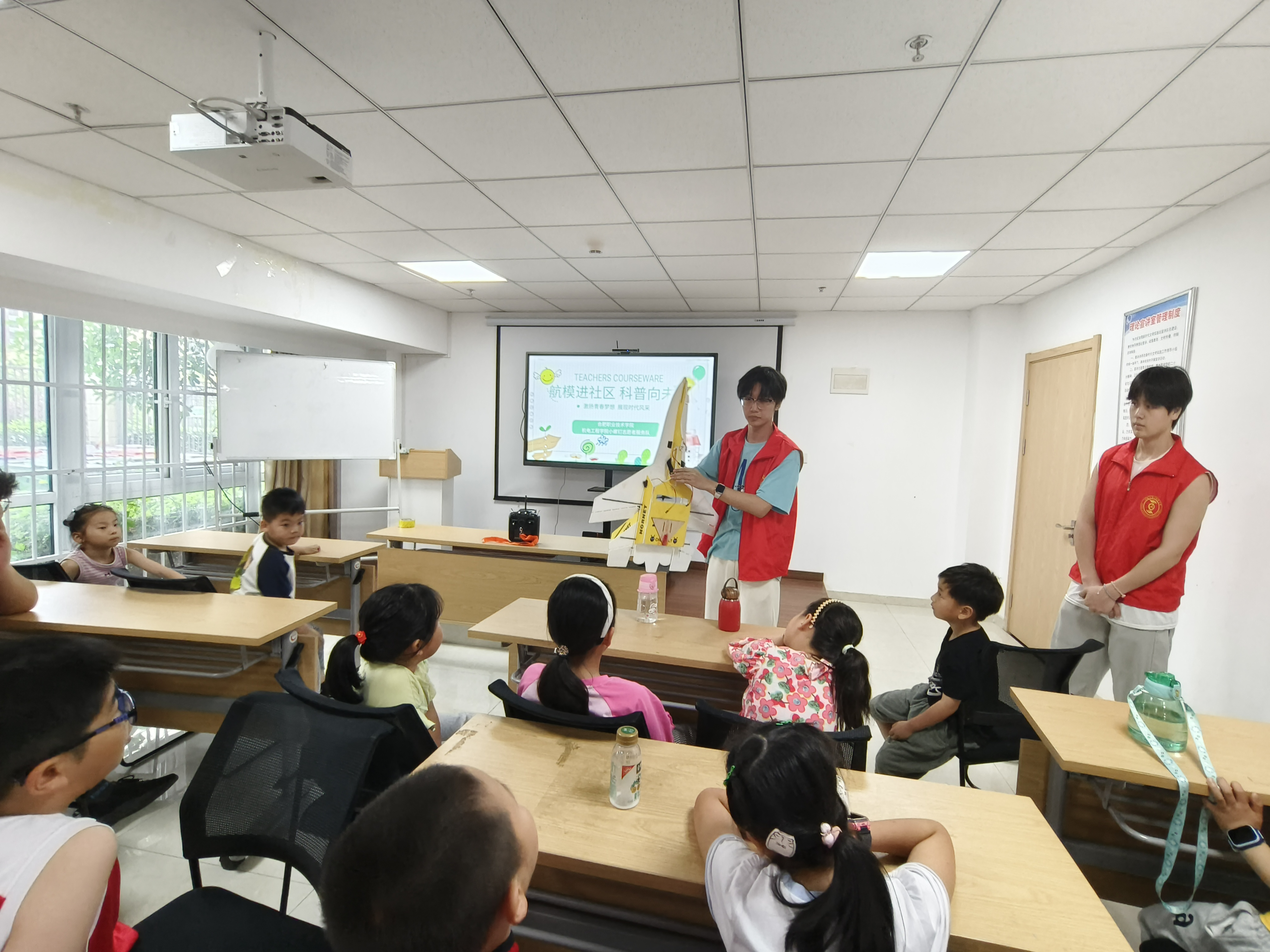 活动筹备阶段,社区承办方通过社交媒体、海报等多种形式在小区里进行了广泛宣传,获得了社区居民的热烈反响。活动当天,志愿者们首先为小朋友们播放了航模飞行视频,通过精彩的航模飞行画面,激发了他们对航模的浓厚兴趣。紧接着,航模协会成员为中小学生详细讲解了航模的组成部分、遥控器操作方法以及飞行技巧等基础知识,让小朋友们对航模有了更深入的了解。