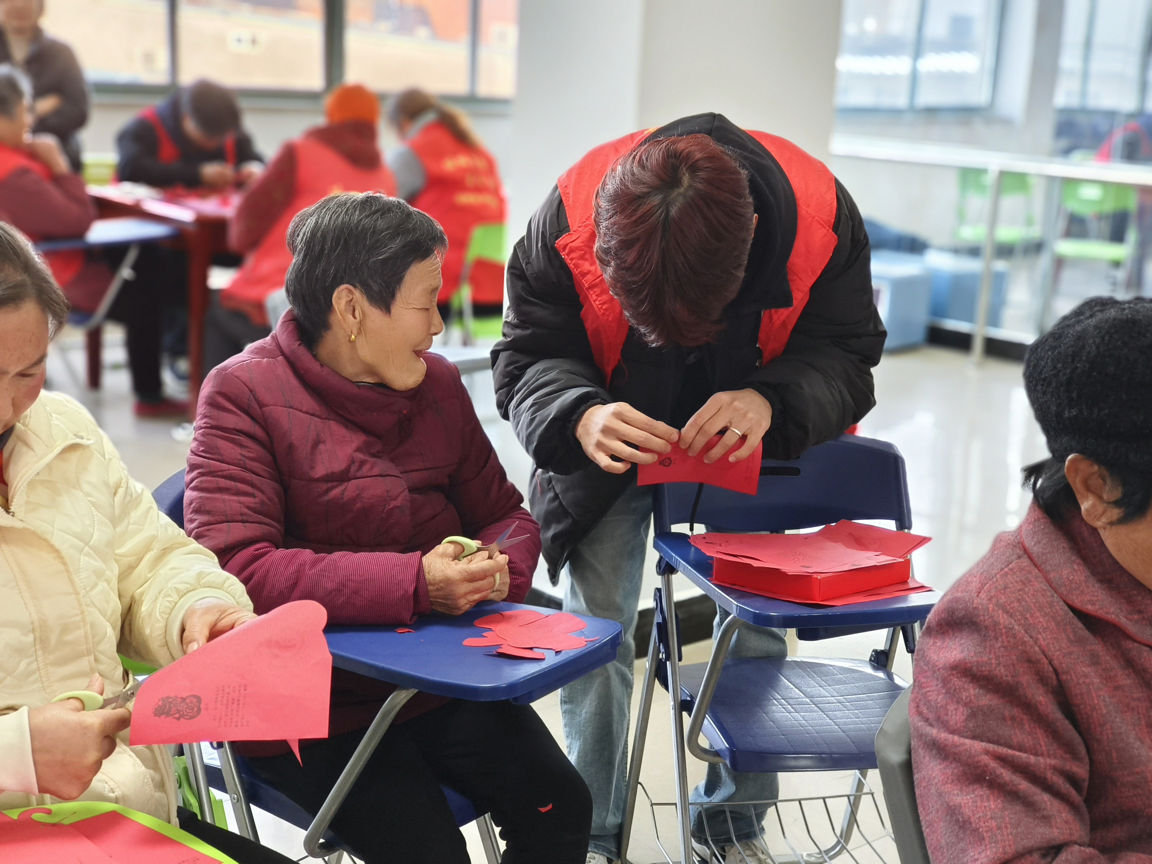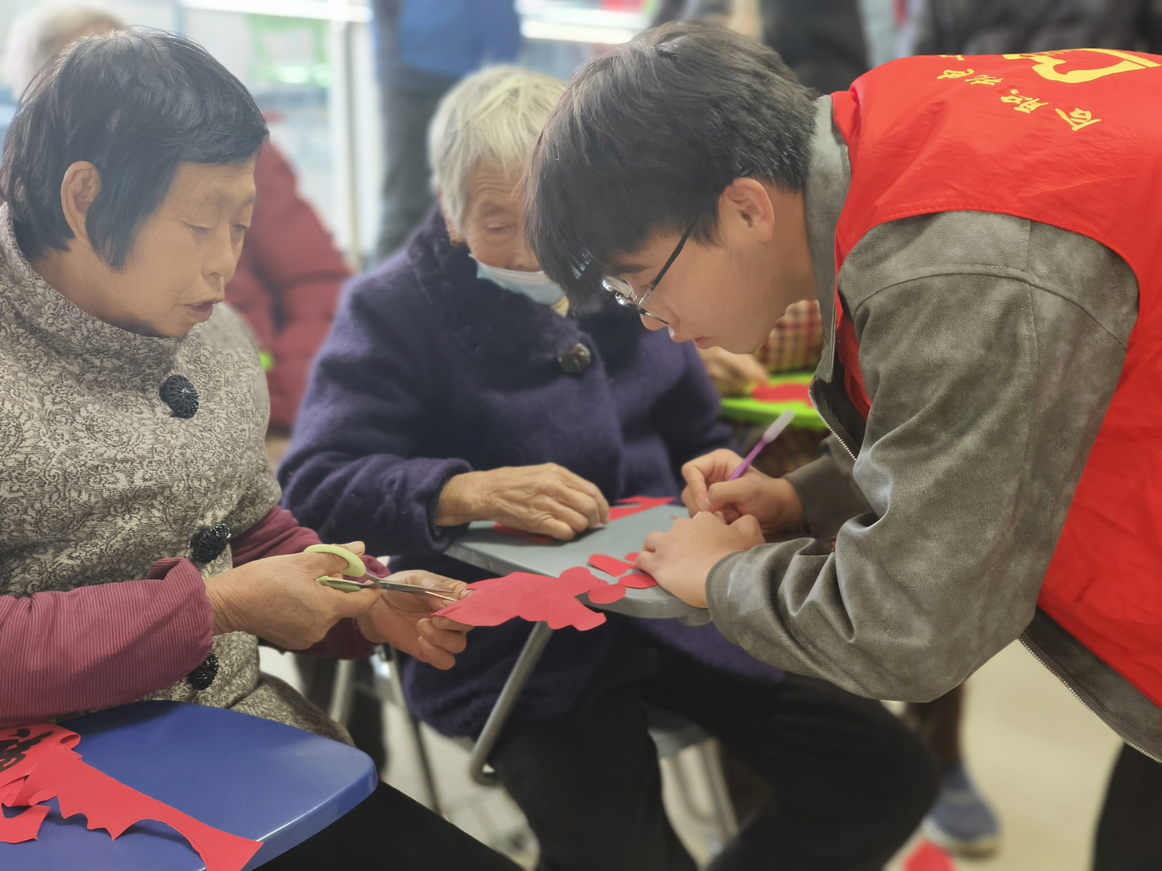 活动当天,志愿者们早早就来到校门口汇合,活动负责人倪家乐同学为每一位志愿者分配了具体任务,并详细介绍了活动内容和注意事项。活动过程中,志愿者们的到来,让平日里安静的社居委充满欢声笑语。志愿者们面带微笑,耐心地陪着老人畅聊生活琐事,认真倾听他们的故事与人生经历。在剪纸活动中更是一片其乐融融的景象,志愿者们小心翼翼地将剪刀和彩纸递到老人手中,轻声叮嘱:“爷爷奶奶,小心手哦。”老人的脸上洋溢着开心的笑容,手中的彩纸在剪刀下逐渐变成了漂亮的图案。在纸牌游戏活动中则充满了紧张和欢乐的氛围,老人们围坐在一起,志愿者们将纸牌洗好,轻轻地放在桌子中间。每当老人打出好牌,志愿者就会鼓掌欢呼:“爷爷,您真厉害,这牌出得太棒了!”
