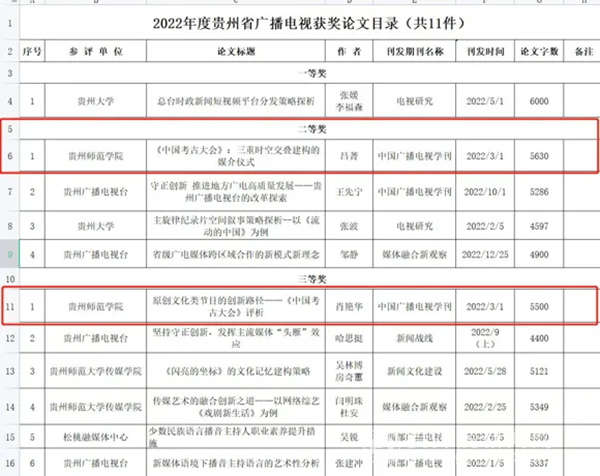 本网讯 5月4日,贵州省广播电视协会公布2022年度贵州省广播电视论文评审结果,共有11篇优秀论文获奖。bat365官网文学与传媒学院教师吕菁、肖艳华的论文《〈中国考古大会〉:三重时空交叠建构的媒介仪式》和《原创文化类节目的创新路径—〈中国考古大会〉评析》分别荣获二等奖、三等奖。