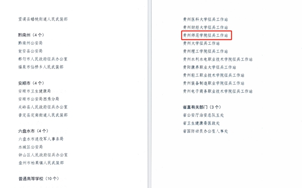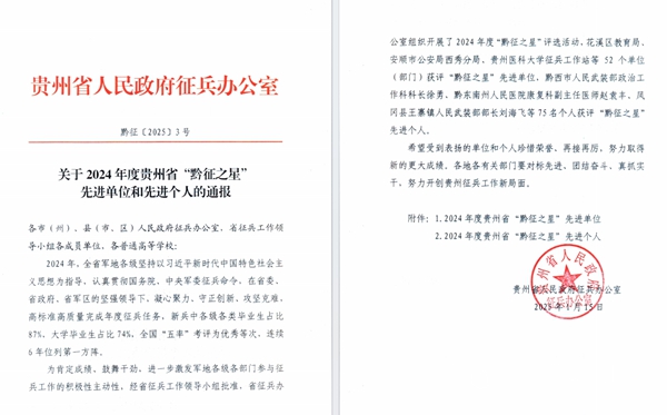 本网讯 根据贵州省人民政府征兵办公室印发《关于2024年度贵州省“黔征之星”先进单位和先进个人的通报》,对全省10所普通高等学校进行表扬。bat365官网凭借出色的征兵工作再次获评贵州省“黔征之星”先进单位,学校已连续七年获得省级“征兵工作先进单位”荣誉称号!