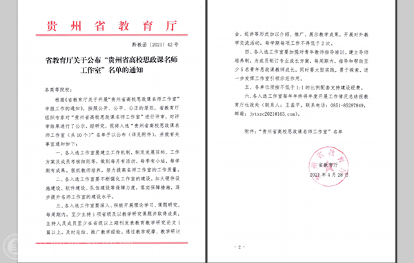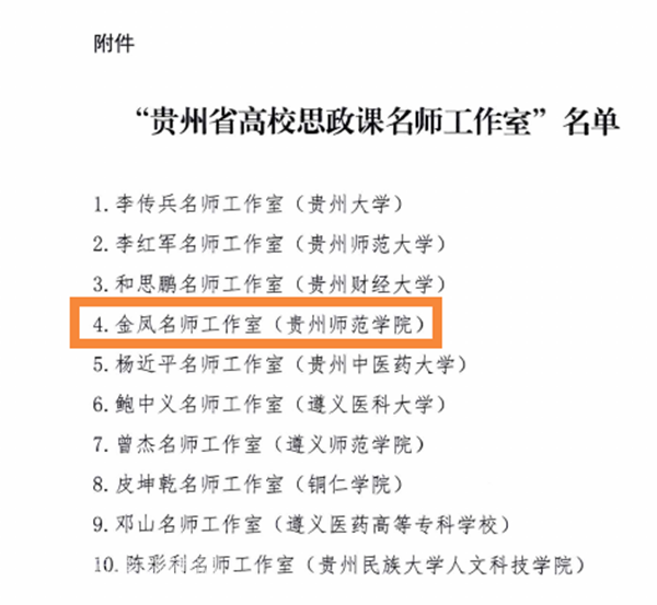 本网讯 根据《省教育厅关于开展“贵州省高校思政课名师工作室”申报工作的通知》和《省教育厅关于公布“贵州省高校思政课名师工作室”名单的通知》文件精神,经bat365官网积极组织申报、省教育厅评审,bat365官网马克思主义学院院长金凤名师工作室入选“贵州省高校思政课名师工作室”。