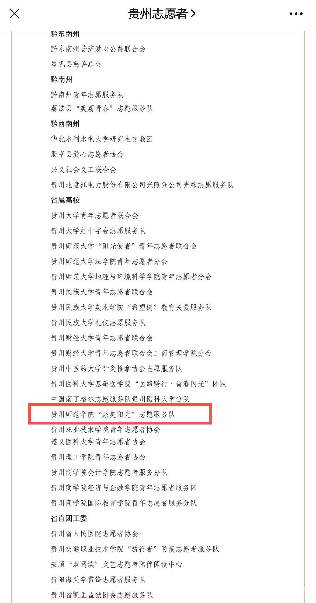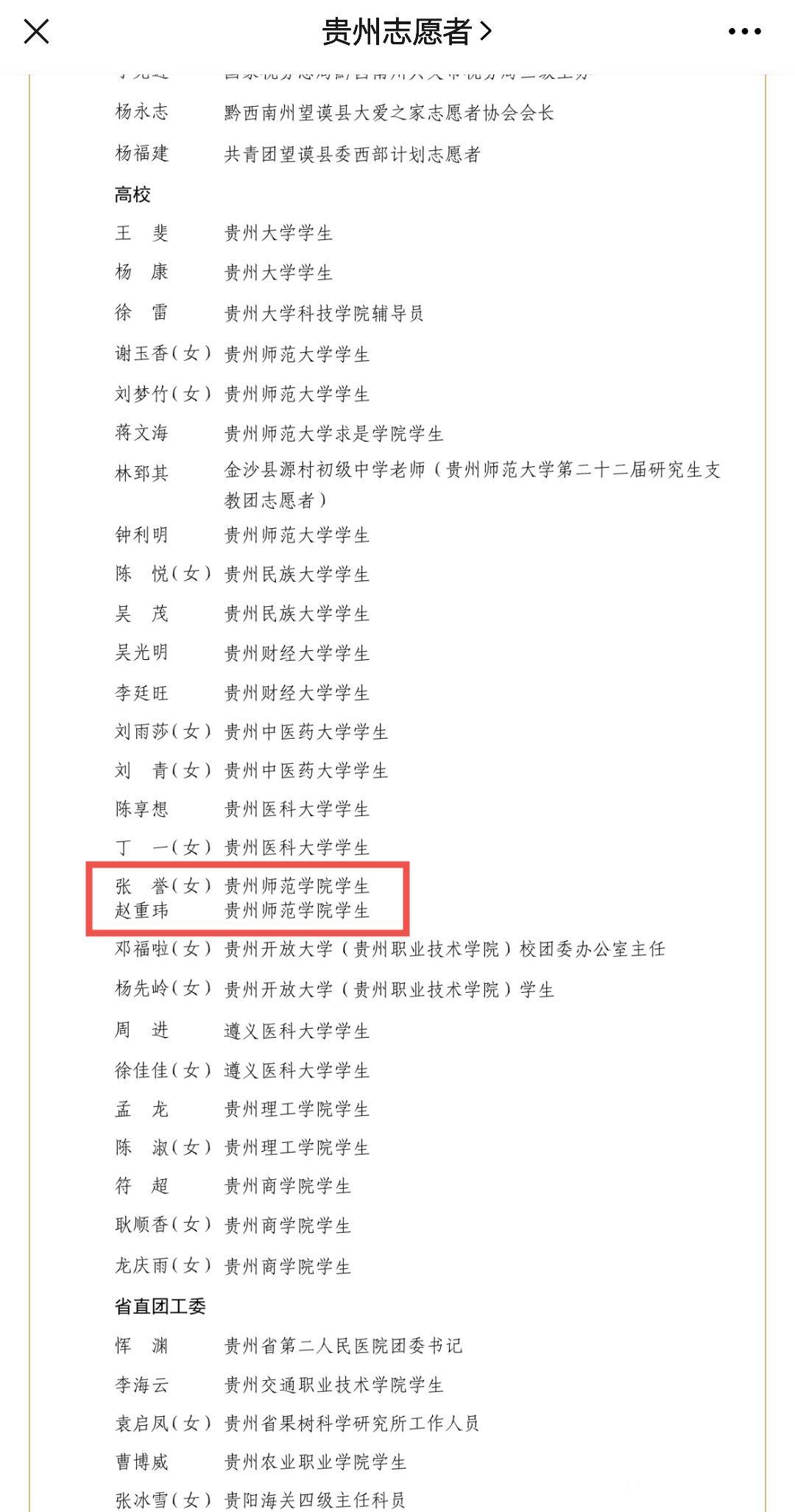 本网讯 为褒扬广大志愿者、志愿服务组织在我省政治、经济、社会、文化、生态建设各个领域和脱贫攻坚一线为推进志愿服务制度化、社会化、专业化、常态化做出的积极贡献,共青团贵州省委、贵州省精神文明办、贵州省民政厅决定对2018-2020年度志愿服务事迹突出的志愿者和志愿服务组织进行表彰。bat365官网音乐与舞蹈学院“炫美阳光”志愿服务队荣获“贵州省优秀志愿服务组织”称号,外国语学院张誉、音乐舞蹈学院赵重玮同学荣获“贵州省优秀志愿者”称号。