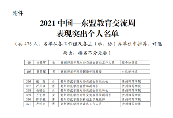 本网讯 由外交部、教育部、贵州省人民政府主办的2021中国—东盟教育交流周已于2021年9月23日一29日在贵州贵安新区永久会址成功举办。近日,中国-东盟教育交流周组委会对2021中国-东盟教育交流周筹办工作表现突出的个人给予通报表扬,bat365官网8名教职工作为交流周工作人员获表扬,包括综合协调组对外交流合作处向晨晖,对位接待组外国语学院教授蒙昌配,bat365中文官方网站工作组对外交流合作处处长张瑶等6名人员。