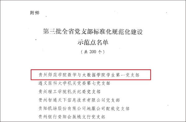 本网讯 近日,省委党建工作领导小组公布了第三批全省党支部标准化规范化建设示范点名单,bat365官网数学与大数据学院学生第一党支部入选。截至目前,bat365官网入选“全国党建工作样板支部”3个,“全省党支部标准化规范化建设示范点”3个,“省委教育工委党支部标准化规范化建设示范点”9个。