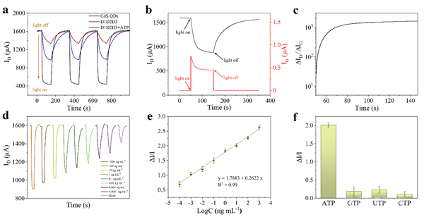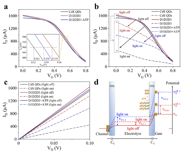 在这项研究中,研究团队提出了一种基于表面电荷的生物调谐和VGeff相应调节的OPECT新型传感器,其具有显著提高的信号分辨率。在该体系中,ATP引发的超分子DNA串联体的拆解可以影响表面负电荷,导致表面电位、通道电导率和ID响应发生变化。值得注意的是,与传统的OPECT相比,该OPECT平台获得了良好的传输特性,并成功地应用于目标物ATP的低限值检测,本项研究的特点是通过调节生物分子电荷用于先进的OPECT生物分析。考虑到自然界中带电生物分子的普遍存在,该方法有望成为OPECT的通用平台,在适当诱导表面电位变化的情况下,探测各种核酸结合、蛋白质识别或生物催化事件。未来对巨大的生物可调性和丰富的光-生物物质相互作用的开发有望产生具有未知特性和应用的创新OPECT生物系统。