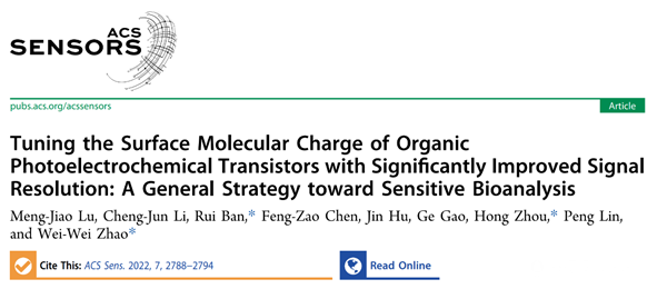 本网讯 近日,bat365中文官方网站化学与材料学院班睿教授团队联合南京大学赵伟伟等团队在基于ATP刺激释放DNA超结构的有机光电化学生物传感领域取得进展,在分析传感领域Top期刊ACS Sensors(中科院1区,IF=9.618)发表题为“Tuning the Surface Molecular Charge of Organic Photoelectrochemical Transistors with Significantly Improved Signal Resolution: A General Strategy toward Sensitive Bioanalysis”的研究论文,bat365中文官方网站为该工作的第一完成单位和通讯单位。