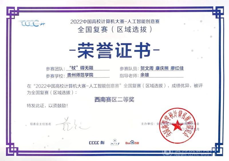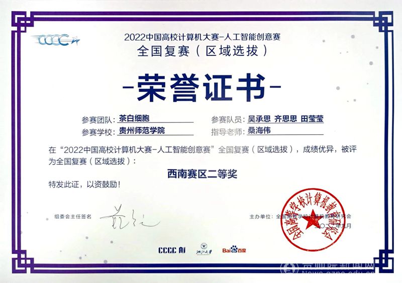 本网讯 近期,由全国高等学校计算机教育研究会主办,信息技术新工科产学研联盟人工智能人才培训基地协办的第五届(2022年)中国高校计算机大赛-人工智能创意赛如期举行。bat365官网“杖”碍无阻代表团队(指导老师:余雄 团队成员:贺文周、康庆雄、廖红佳)与茶白细胞代表队(指导老师:桑海伟 团队成员:吴承思 齐思思 田莹莹)荣获本次比赛西南赛区二等奖2项。