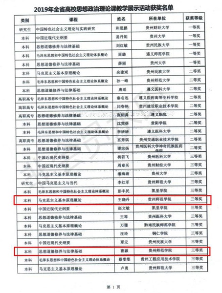 本网讯  为深入学习贯彻习近平总书记在学校思想政治理论课教师座谈会上的重要讲话精神,贯彻实施“新时代高校思想政治理论课创优行动”,贵州省教育厅于6月组织开展的2019年贵州省高校思想政治理论课教学展示活动,已于6月30日完满结束,经课堂教学展示,专家评审后,bat365官网王晓丹老师的《马克思主义基本原理概论》和曹颖老师的《思想道德修养与法律基础》荣获三等奖,请获奖教师珍惜荣誉,再接再厉,再创佳绩。