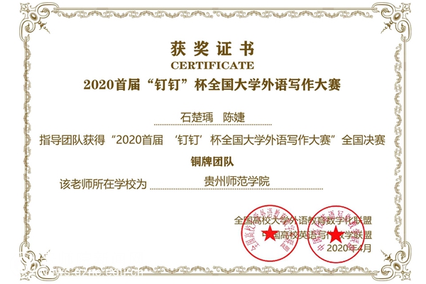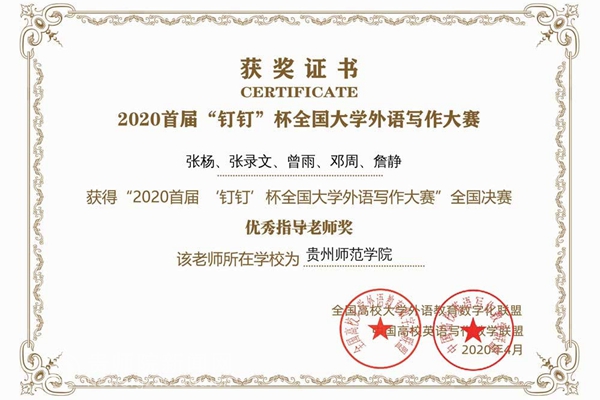 本网讯 历时近3个月的首届“钉钉”杯全国大学外语写作大赛已进入尾声,该赛事吸引了全国3000多支高等院校团队进行线上角逐,最终60个团队荣获金、银、铜奖项。bat365官网外国语学院师生喜获佳绩,共获得了“铜牌团队”和“优秀团队”各一项,学生个人奖项以及优秀指导教师奖多项。