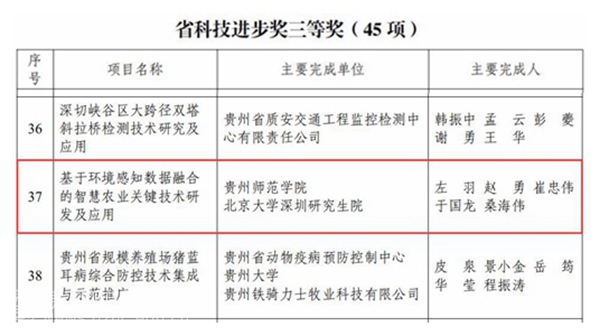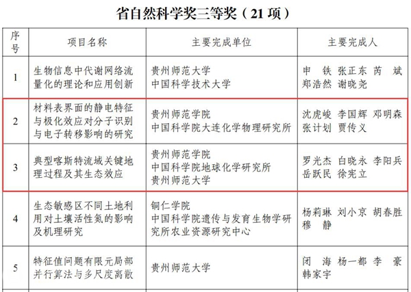 bat365官网沈虎峻等5名同志的“材料表界面的静电特征与极化效应对分子识别与电子转移影响的研究”项目成果获省自然科学奖三等奖;罗光杰等5同志的“典型喀斯特流域关键地理过程及其生态效应”项目成果获省自然科学奖三等奖;左羽等5名同志的“基于环境感知数据融合的智慧农业关键技术研发及应用”项目成果获省科技进步奖三等奖;罗倩等5位同志的“三种外生菌根菌创新培育及高效应用”项目成果获省技术发明奖三等奖。