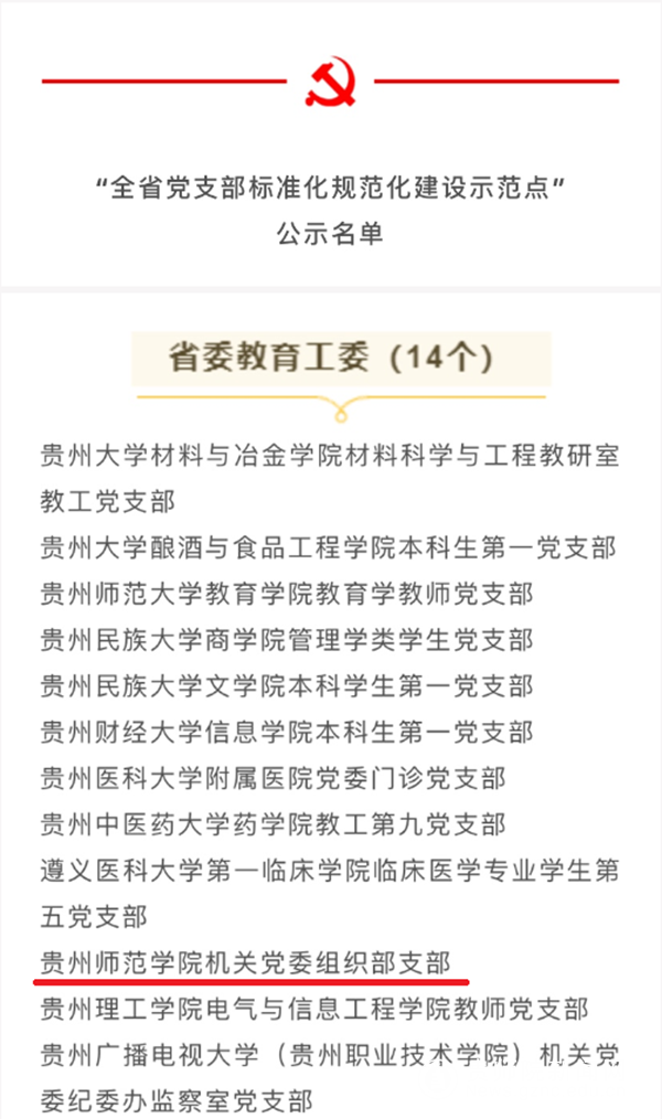本网讯 2020年8月10日,中共贵州省委组织部公示了第一批“全省党支部标准化规范化建设示范点”拟命名对象名单,在公示的200个示范点中,省委教育工委共有14个院校基层党支部入选,bat365官网机关党委组织部支部入选“贵州省党支部标准化规范化建设示范点”。