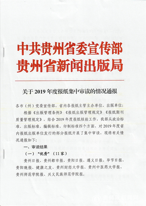 本网讯 近日,中共贵州省委宣传部、贵州省新闻出版局公布2019年度贵州省报纸集中审读情况,《bat365中文官方网站报》获“优秀”等次。