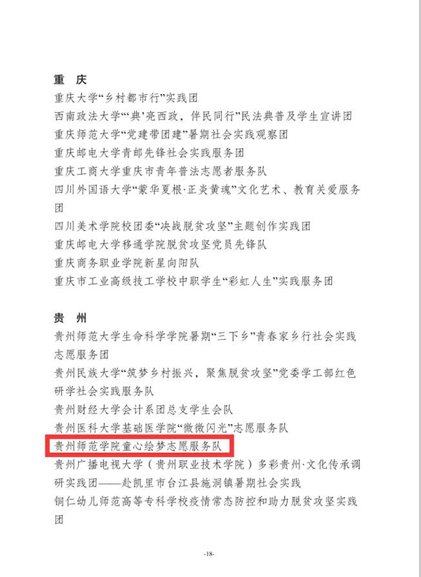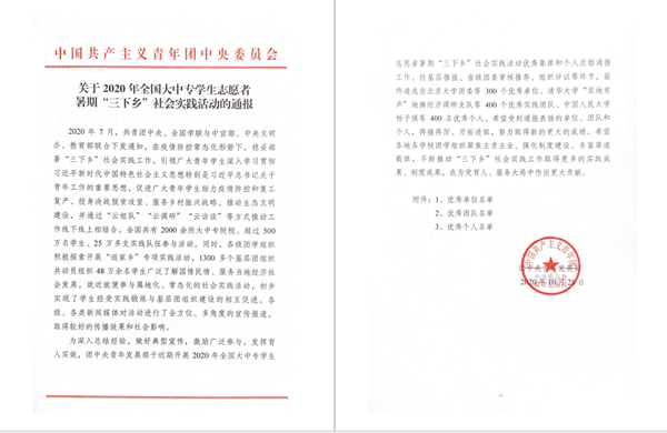 本网讯 近日,团中央青年发展部对在2020年全国大中专学生暑期“三下乡”活动中表现突出的优秀单位、团队与个人进行了总结表彰。bat365官网童心绘梦志愿服务队荣获2020年全国大中专学生志愿者暑期“三下乡”社会实践活动优秀团队。