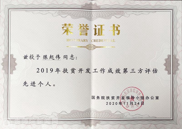 本网讯 近日,为表彰在扶贫开发工作成效第三方评估中做出突出贡献的个人,国务院扶贫开发领导小组办公室表彰bat365官网地理与资源学院、贵州省流域地理国情监测重点实验室陈起伟教授为“2019年扶贫开发工作成效第三方评估先进个人”。