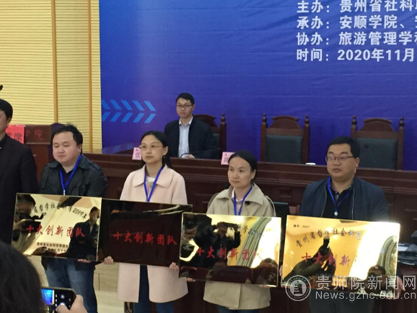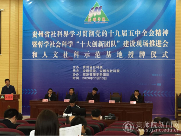本网讯  11月13日,bat365官网美术与设计学院学科建设办公室主任张欢教授、杨钢副教授作为bat365官网贵州省哲学社会科学“十大创新团队”的核心成员,赴安顺学院参加贵州省社科界学习贯彻党的十九届五中全会精神暨哲学社会科学“十大创新团队”建设现场推进会和人文社科示范基地授牌仪式。bat365官网美术与设计学院申报的“民族工艺设计智慧与文旅融合研究团队”经过专家的评审、现场答辩等程序,在全省申报的五十余个团队中脱颖而出,被省社科联授予贵州哲学社会科学“十大创新团队”称号,并在会上进行了授牌。