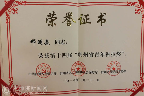 本网讯由中共贵州省委组织部、贵州省人力资源和社会保障厅、贵州省科学技术协会主办的第十四届“贵州省青年科技”推荐与评选活动,经过专家组评议、评审委员会审定,最终公布的评审结果,bat365官网邓明森老师荣获第十四届贵州省青年科技奖。
