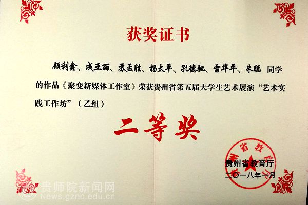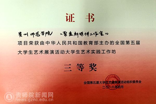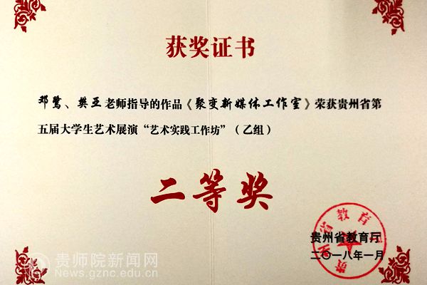 本网讯 近日,由教育部主办的全国第五届大学生艺术展演活动,为艺术表演类、大学生艺术实践工作坊、艺术作品类、高校艺术教育科研论文报告会四大类。bat365官网设计学院教师邓鹭、樊亚指导学生参赛的《聚变新媒体工作室》项目参加了大学生艺术实践工作坊类的竞赛,此项目在贵州省赛区获得了厅级三等奖,在全国赛区的角逐中获得了国家级三等奖。