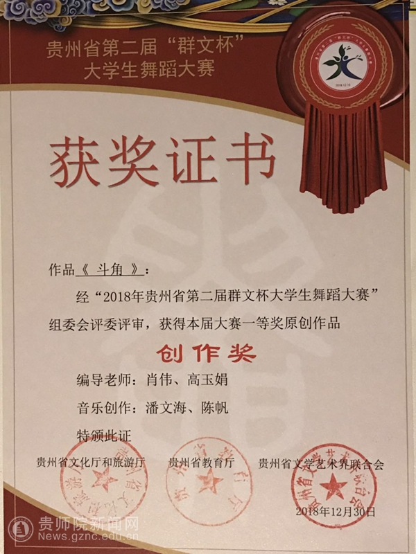 该活动自2018年12月启动以来,来自贵州省36所高校的4000余人积极参赛,初赛从各市(州)选拔出154个节目进入复赛,经过组织专家组观摩和评议,最终评选出群舞、单、双、三人组舞蹈共23个节目进入决赛。我院选送的作品《斗角》、《刘胡兰》、《逗》、《青丝红颜》均在此次比赛中获得优异成绩。作品《斗角》荣获群舞组“一等奖”和原创作品“创作奖”;作品《刘胡兰》在此次比赛中荣获单、双、三人舞组“二等奖”;作品《逗》在此次比赛中荣获单、双、三人舞组“三等奖”;作品《青丝红颜》在此次比赛中荣获“优秀作品奖”。四个作品的指导老师均荣获“优秀指导老师奖”。