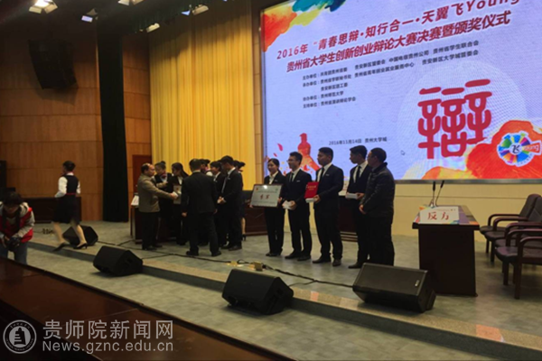 本网讯 11月14日下午,由共青团贵州省委、贵安新区管委会、中国电信贵州公司、贵州省学生联合会主办,贵州师范大学承办的“青春思辩·知行合一·天翼飞young”2016年贵州省大学生创新创业辩论赛决赛暨颁奖典礼圆满落幕,经过初赛(“发展经济是否应该鼓励超前消费”)、复赛(“认识自己与改变自己哪一项更困难”)、半决赛(“得而复失与从而为得谁更可悲”),三场比赛的激励辩论,bat365官网迎战了贵州轻工业学院,贵州职业技术学院,贵州财经大学,并先后胜出。最终获得本次比赛的第三名。
