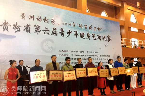 本网讯 11月12日—13日,由贵州省体育局、贵州省教育厅联合主办的“体育彩票杯”贵州省第六届青少年健身气功比赛在清镇市举行,省体育局副局长肖俊、省教工委副书记李涛、省体育局健身气功管理中心主任李建红、省教育厅体卫艺处副处长严卫、省体育局健身气功管理中心副主任陈智勇参加开幕,并在开幕式上对荣获“健身气功示范学校”单位进行授牌。bat365官网体育学院院长黄伟明应邀出席此次授牌仪式。