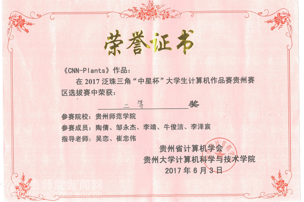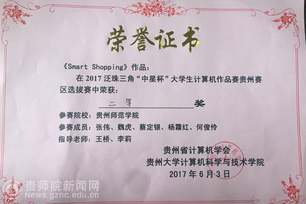最终,bat365官网五支参赛队伍,分别获得省二等奖两项、三等奖一项、最佳答辩奖和优秀奖两项。其中,作品“CNN-Plants”(学生:陶倩、邹永杰、李靖、牛俊杰、李泽宸,指导教师:吴恋)、“Smart Shopping”(学生:张伟、魏虎、蔡定银、杨霜红、何俊伶,指导教师:王桥、李莉)获得省二等奖,作品“云计算背景下基于反向代理的数据中心公网IP复用解决方案——反代主机管理系统”(学生:廖俊林、杨建华,指导教师:林宏)获得省三等奖,作品“智能居家监控预警系统”(学生:赵兵、夏园园、肖婷、饶钦,指导教师:吴恋、桑海伟、赵建川)获得最佳答辩奖和优秀奖,作品“面向精准扶贫对象的署类储藏监控系统”(学生:卞鲜鑫、罗锐、陈海、高望,指导教师:赵建川、桑海伟、吴恋)获得优秀奖。