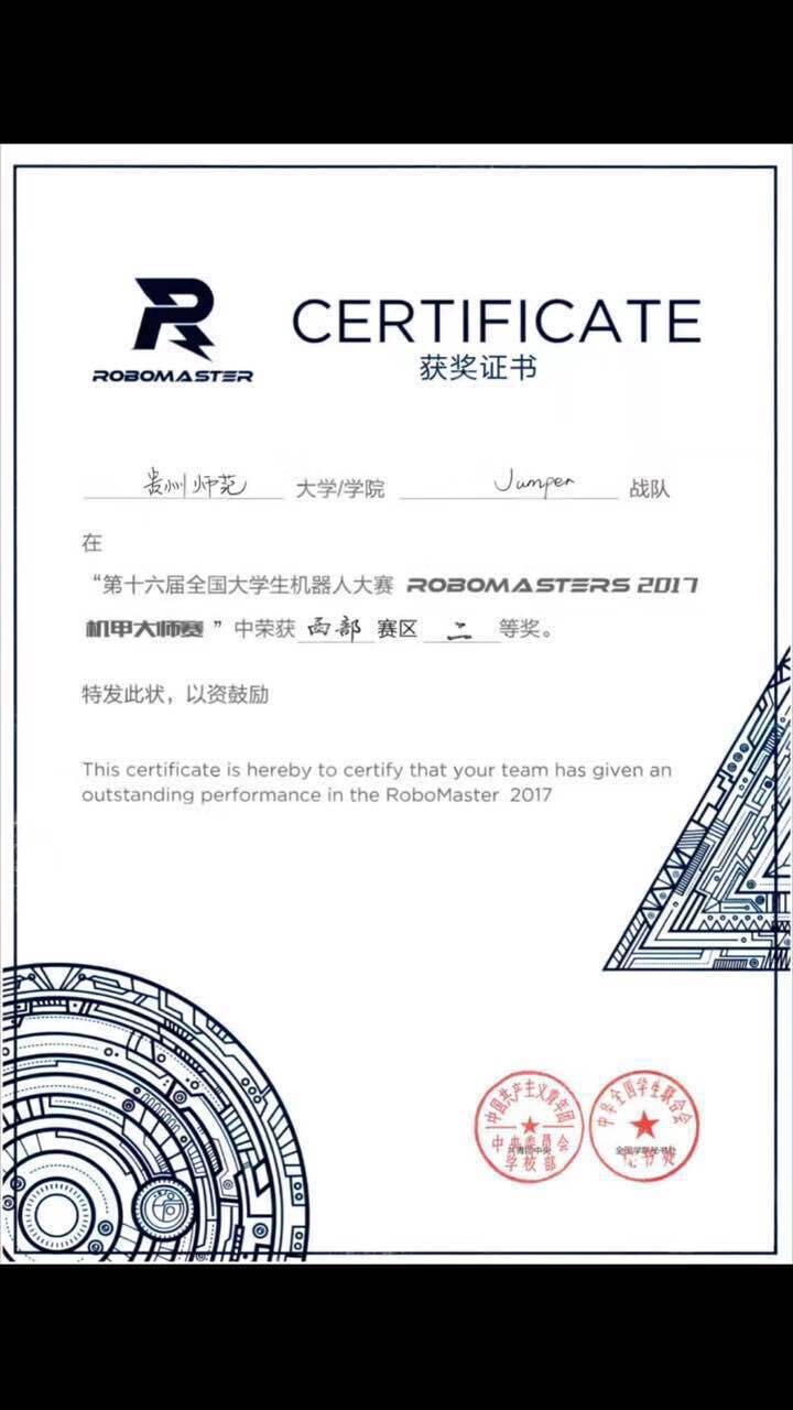 bat365官网团委高度重视本次比赛,组织了来自智电大创中心三名指导教师组成的教练团,并在全校选拔了来自物电学院、地理与旅游学院、体育学院组成了15人战队。此次西部赛区的全国赛名额争夺激烈异常,它强调对抗、作战和技术,比赛双方都尽全力击溃对手。每场比赛,参赛队伍可布置7台机器人:包括一名英雄机器人、一名基地机器人、一名空中机器人、一名工程机器人和三名步兵机器人。选手操控机器人发射大小两种弹丸攻击敌方。在7分钟的比赛时间结束后,基地被毁或血量较低的一方将输掉比赛。在众多高校中,其中就有连续两年的总决赛冠军的电子科技大学,作为种子队伍的西安交通大学、兰州理工大学以及拥有多届参赛经验的四川大学、钦州学院等。bat365官网席源枫、陶清雨、熊文等9名同学组成的Jumper战队,在指导老师邓睿、莫章洁的带领下,与电子科技大学、四川大学、西安交通大学、重庆大学等22支高校队伍同台竞技,经过激烈的角逐,获得了西部赛区二等奖,也赢得了全国总决赛踢馆赛的资格。
