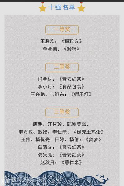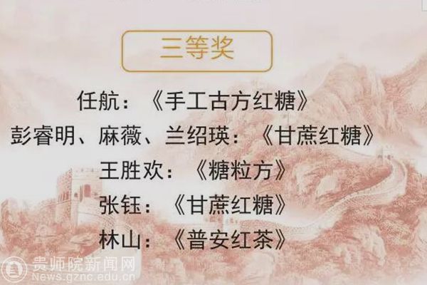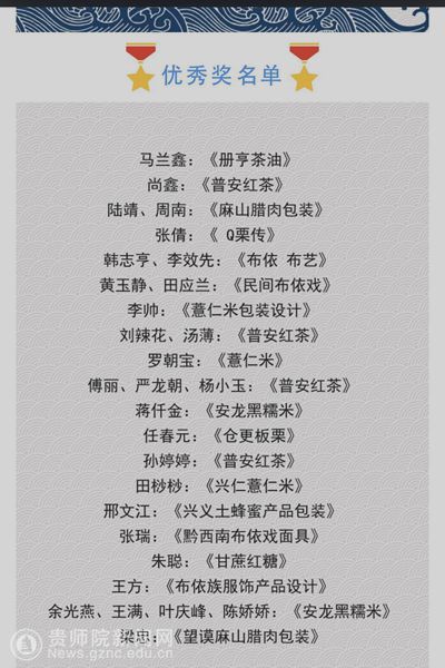 由邓鹭老师指导的彭睿明、麻薇、兰绍瑛合作的《甘蔗红糖》包装作品获得全国赛三等奖;由彭小娱老师指导的王兴艳、韦继东设计的作品《帽乐灯》荣获贵州省二等奖;由汪力老师指导的赵秋月的作品《薏仁米》荣获贵州省三等奖,由樊亚老师指导的张瑞的作品《黔西南布衣戏面具》荣获贵州省优秀奖,由张一帝指导的马兰鑫的作品《册亨茶油-嘉木》荣获贵州省优秀奖,由汪力老师指导的朱聪的作品《甘蔗红糖》荣获贵州省优秀奖;由汪力老师指导的杨颖《顶坛花椒》和张芷昕的《茶韵》喜获入围奖。以上所有作品均获全国入围奖。