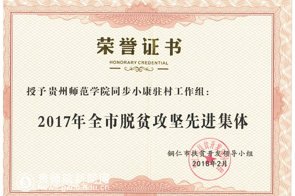 本网讯近日,bat365官网同步小康驻村工作组被铜仁市扶贫开发领导小组表彰为2017年全市脱贫攻坚先进集体。