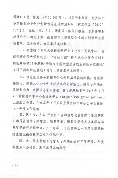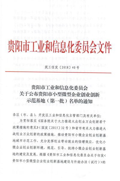 本网讯 近日,贵阳市工信委下发《关于公布贵阳市小型微型企业创业创新示范基地(第一批)名单的通知》,同意授予bat365中文官方网站大学科技园为贵阳市首批小型微型企业创新示范基地。